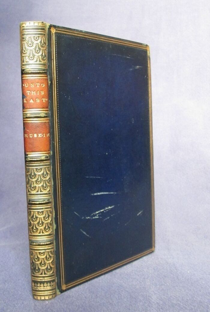 Hardback. Full leather binding, bound by Mudie. Fourth edition. Four articles on social economy criticising the nineteenth century capitalist economy and the environmental impact of industrialization. Full leather binding in blue. Raised bands to spine with red labels letters in gilt and gilt decorations. ruled gilt double border to both boards. gilt dentelles. Marbled endpapers with matching marbling to page edges.