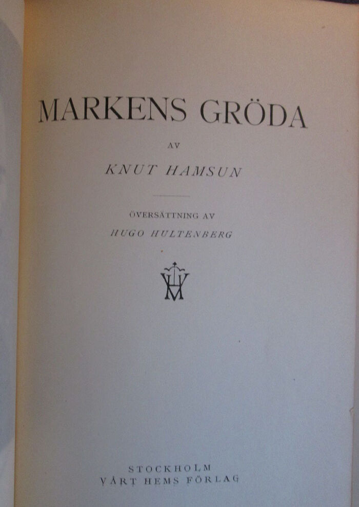 Hardback. 179pp. Swedish translation of Norwegian novelist Knut Hamsun’s Markens Grøde. Half bound in tan calf with green label and gilt titles and decorations to spine between blind impressed bands. Decorative papers to boards in a tree-like marbling effect. Gilt to top edge.Black and white frontis.