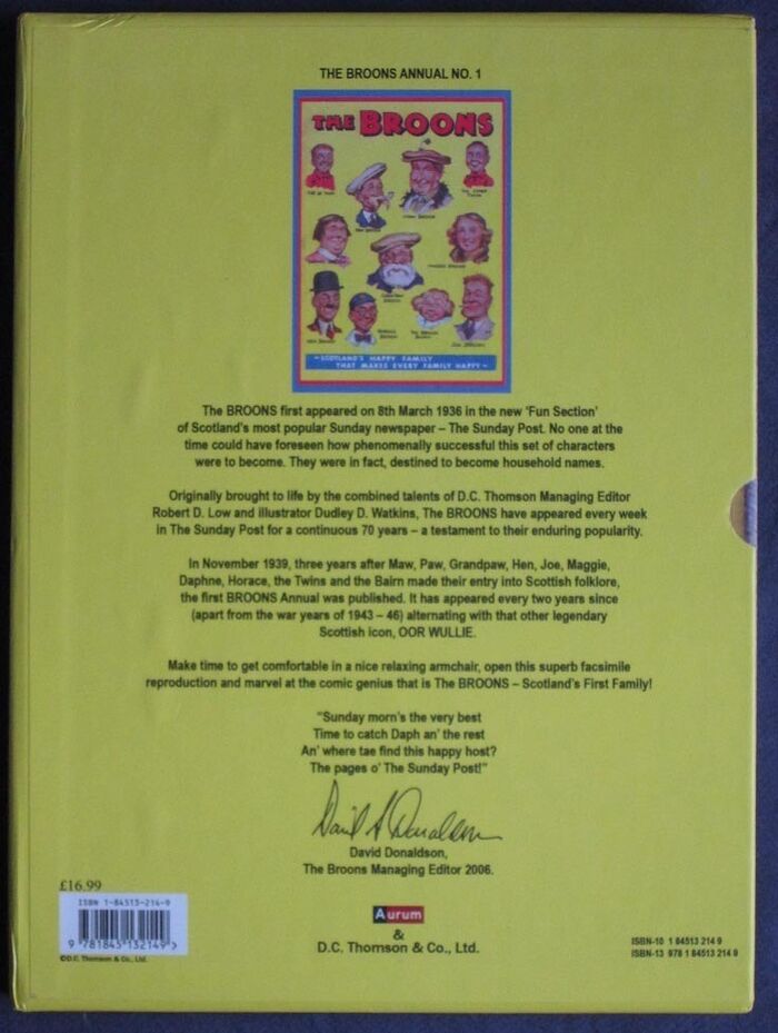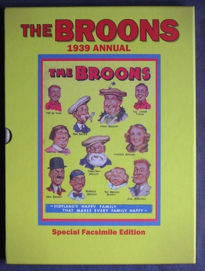 Hardback. 96pp. Special facsimile edition of the first ever Broons annual of 1939. Black and white cartoon illustrations throughout. Yellow pictorial boards. Yellow pictorial slipcase.