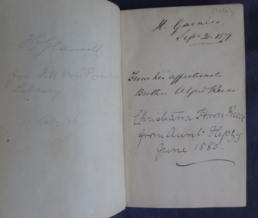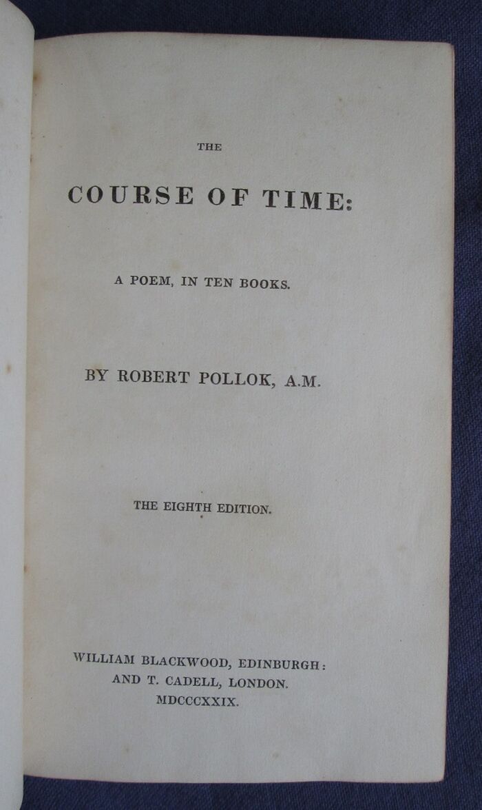 Hardback. Early edition of this work published not long after the Scottish poet’s early death at the age of 28. Half leather binding, with marbled boards. Highly gilt decorated spine with raised bands. Rather nice range of nineteenth century previous owner inscriptions including that of hymn writer Christiana Helene von Poseck of the Plymouth Brethren from her maternal aunt Hepzibah Wilson.